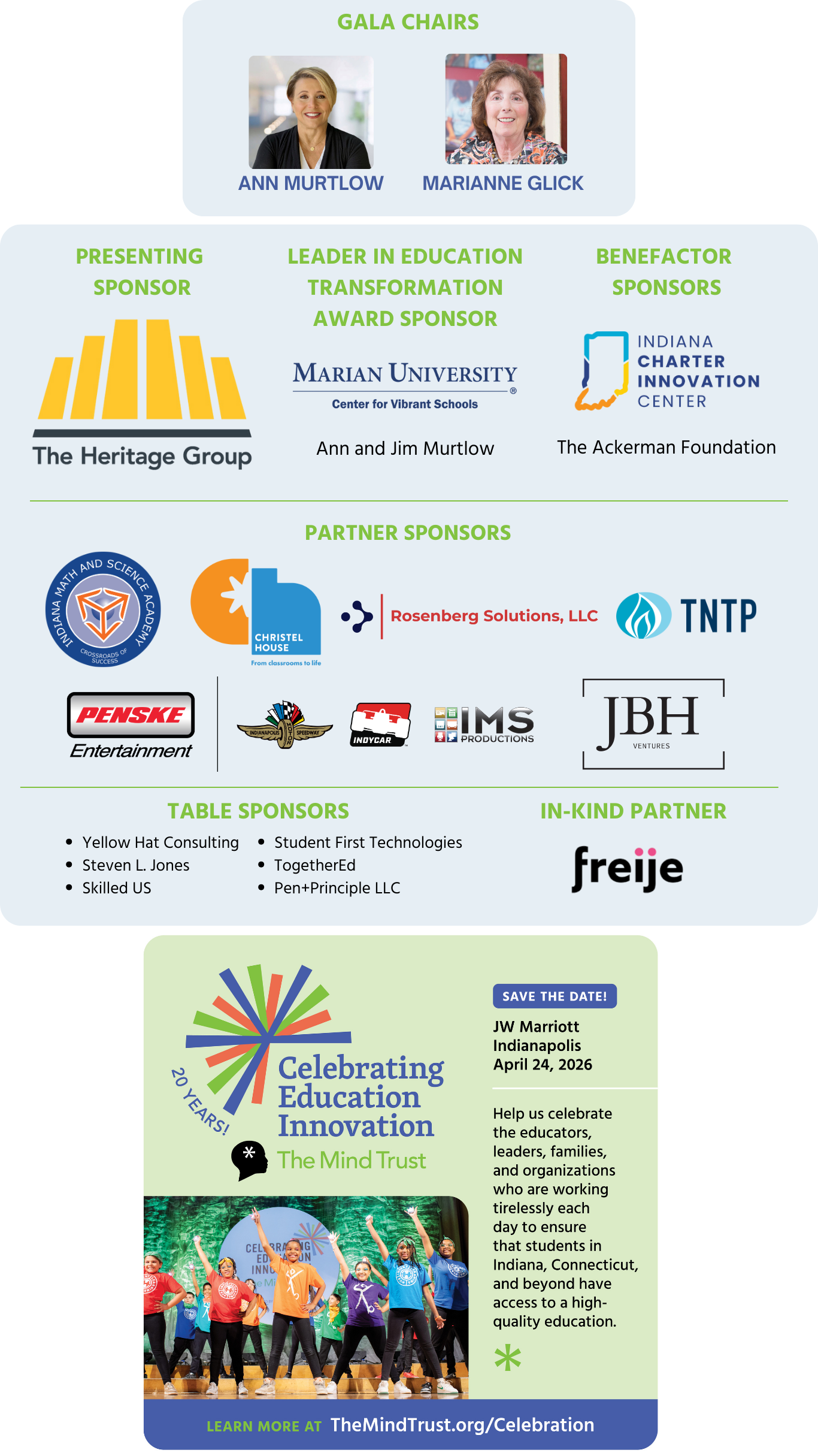 Join The Mind Trust on Friday, April 24, 2026, for Celebrating Education Innovation! The event celebrates the leaders, educators, families, and organizations who work tirelessly to ensure students in the regions we serve have access to high-quality education. We look forward to celebrating exciting progress happening in Indianapolis and across Indiana and Connecticut.
